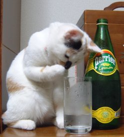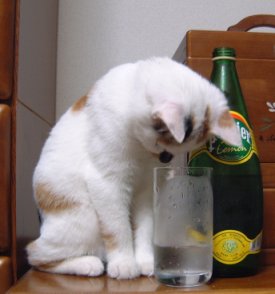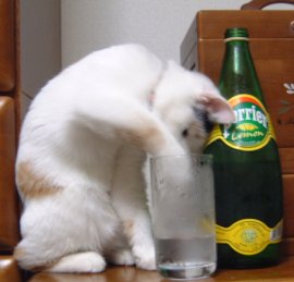 そして手を舐めるのです。これを何度も何度も繰り返していました。よほど味が気に入ったのか,少しも口に入らなかったのか,どちらなのでしょう・・。ちなみに,「炭酸が面白いのかな?」と思って,ふつうの炭酸入りのジュースや,シャンパンなどもコップに入れて出してみたのですが,ぜんぜん興味を示してくれませんでした(^^;(2000.11.24) |