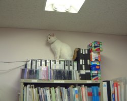 | ふと気がついたら,本棚の上に積み上げてあるフロッピーディスクの,そのまた上にりこさんの姿が・・(2000.12.18) |